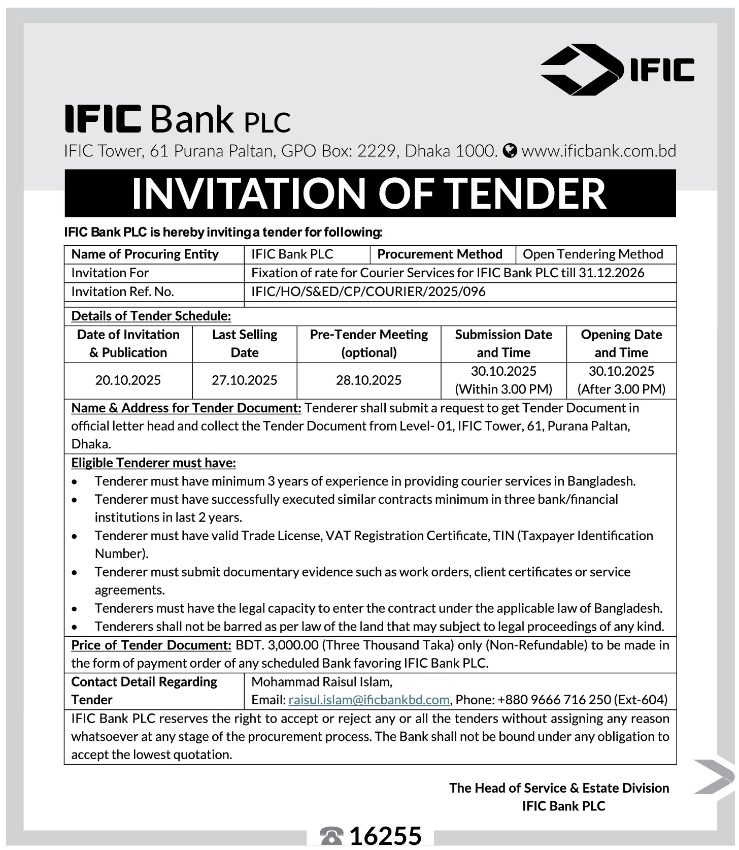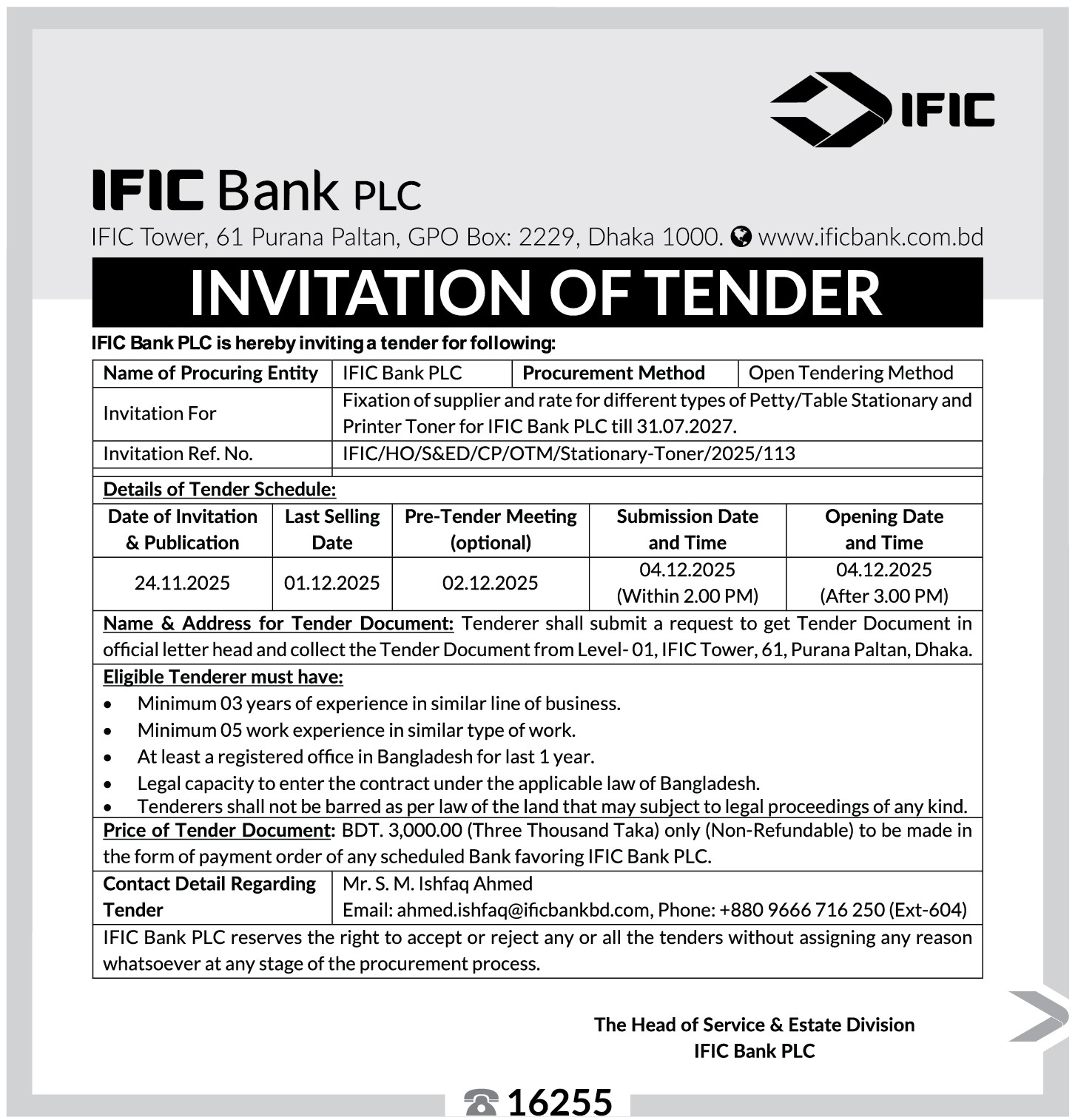 Tender for supply of Petty/Table Stationery for IFIC Bank up to February 28, 2026