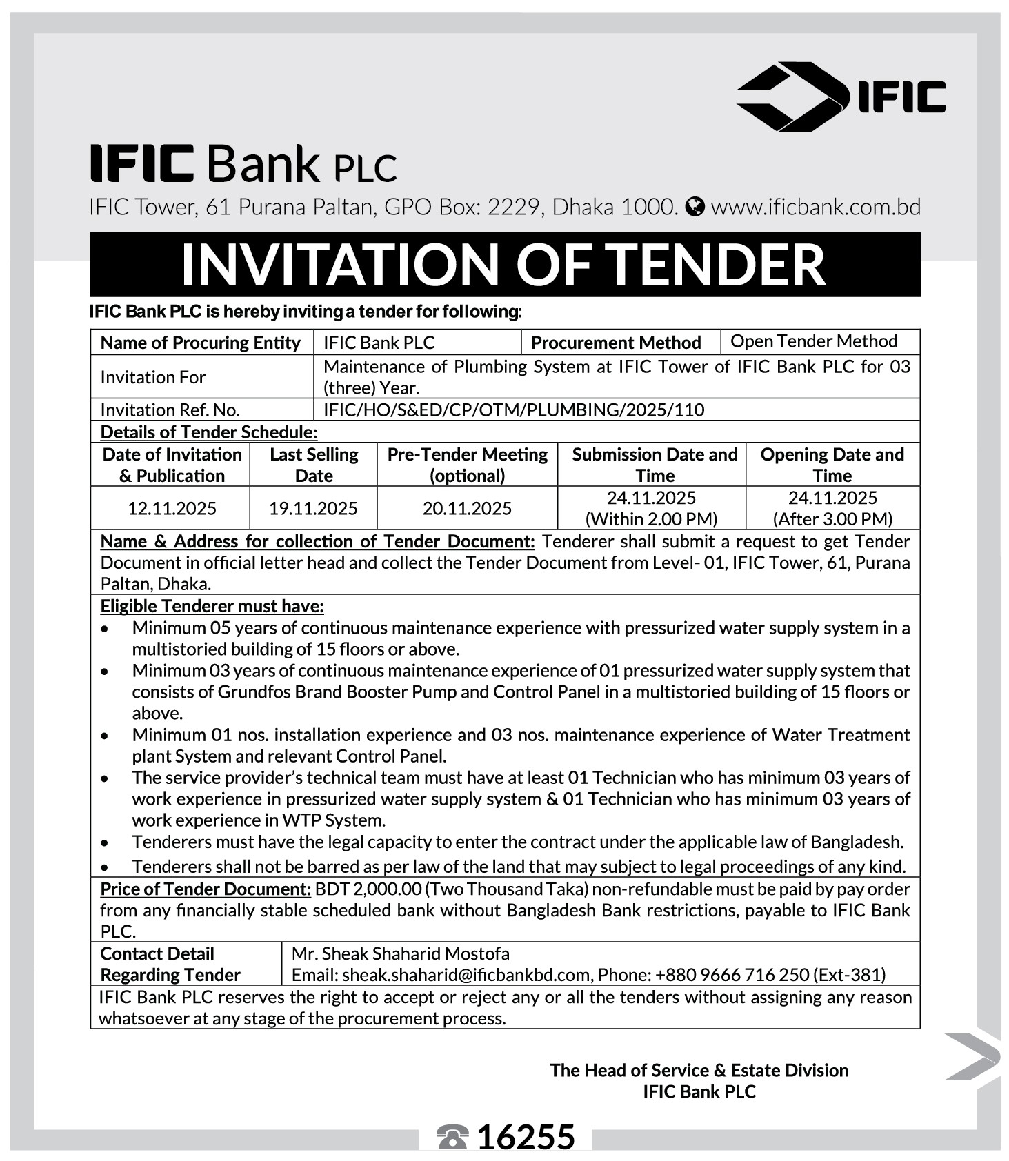 Maintenance of Plumbing system at IFIC Tower for IFIC Bank PLC for 03 (three) Years