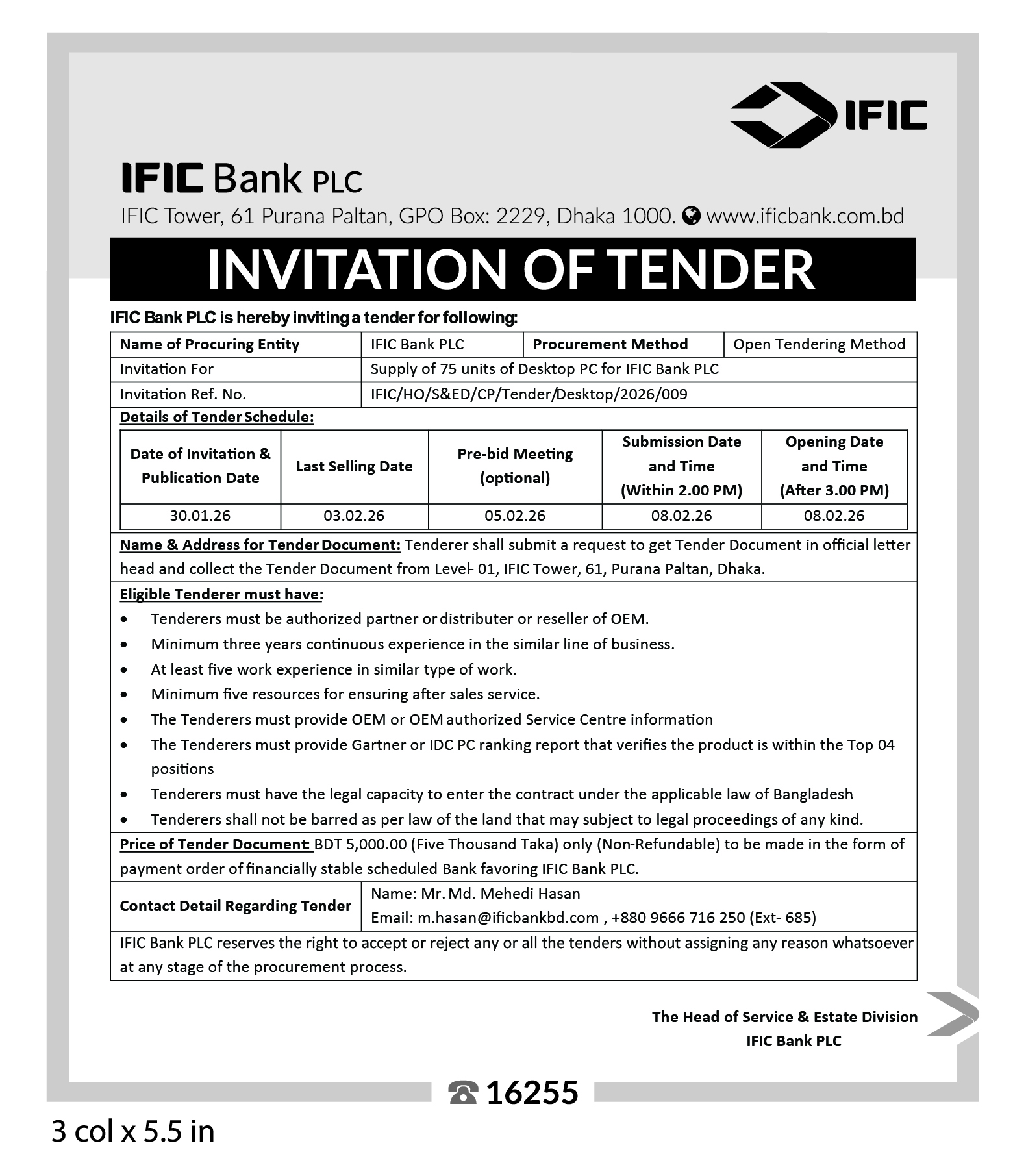 Tender Notice for “ Supply of 100 units of Desktop for IFIC Bank PLC”
