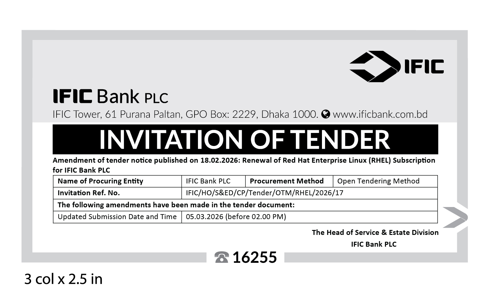 Tender Notice for “Fixation of suppliers & rates of 14 (Fourteen) General Items for IFIC Bank PLC up to July 31, 2026”