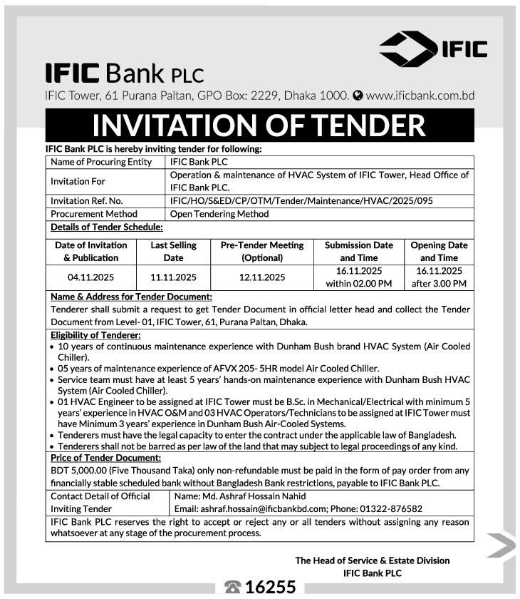Invitation of tender for “Operation & Maintenance of HVAC System of IFIC Tower"