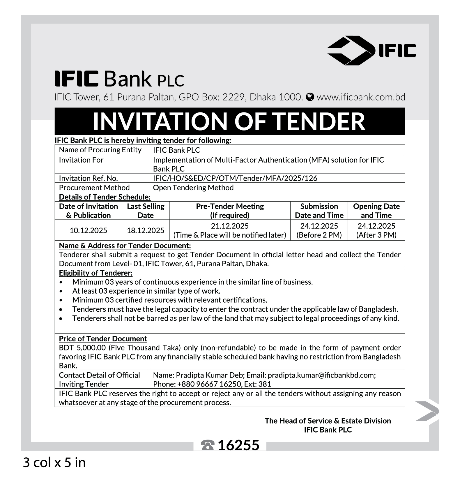Tender Notice on “Vulnerability Management as a Service for IT Environment of IFIC Bank PLC.”