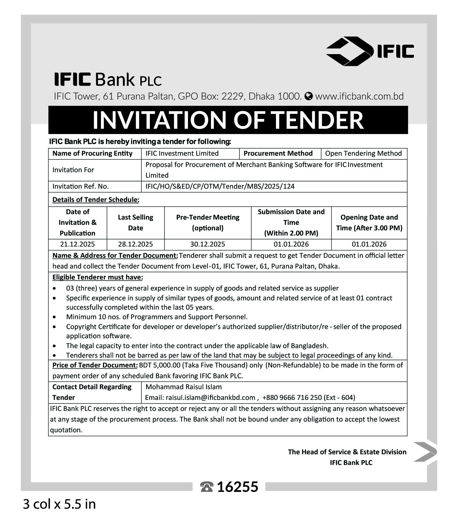 Tender Notice for “Fixation of suppliers & rates of 14 (Fourteen) General Items for IFIC Bank PLC up to July 31, 2026”