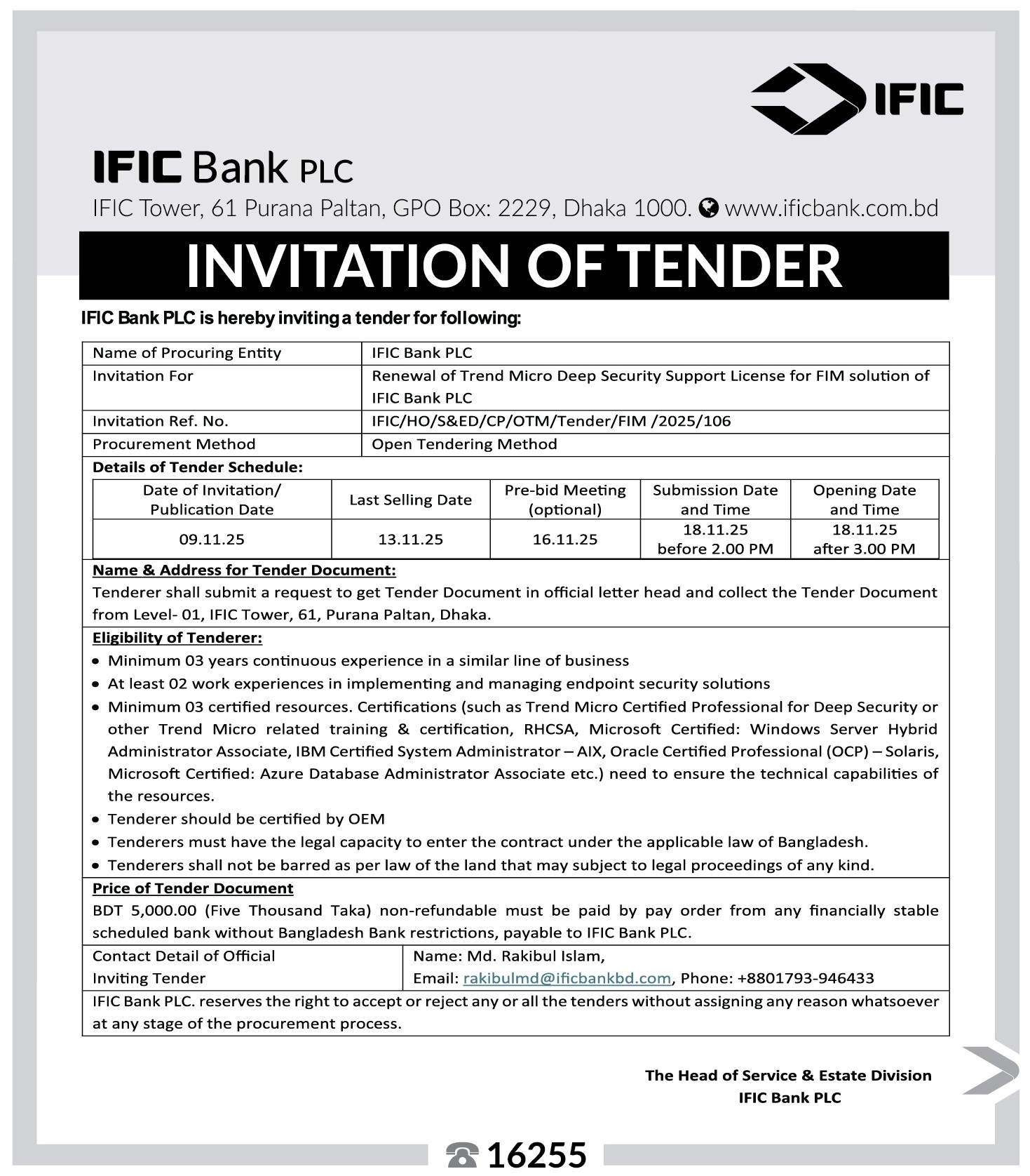 Tender Notice on “Vulnerability Management as a Service for IT Environment of IFIC Bank PLC.”